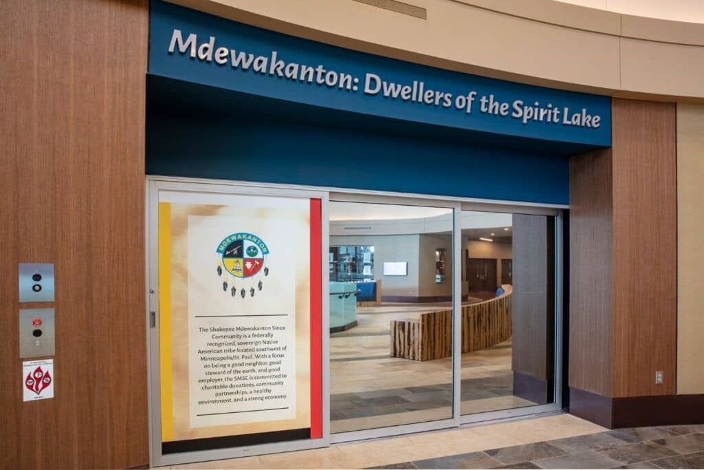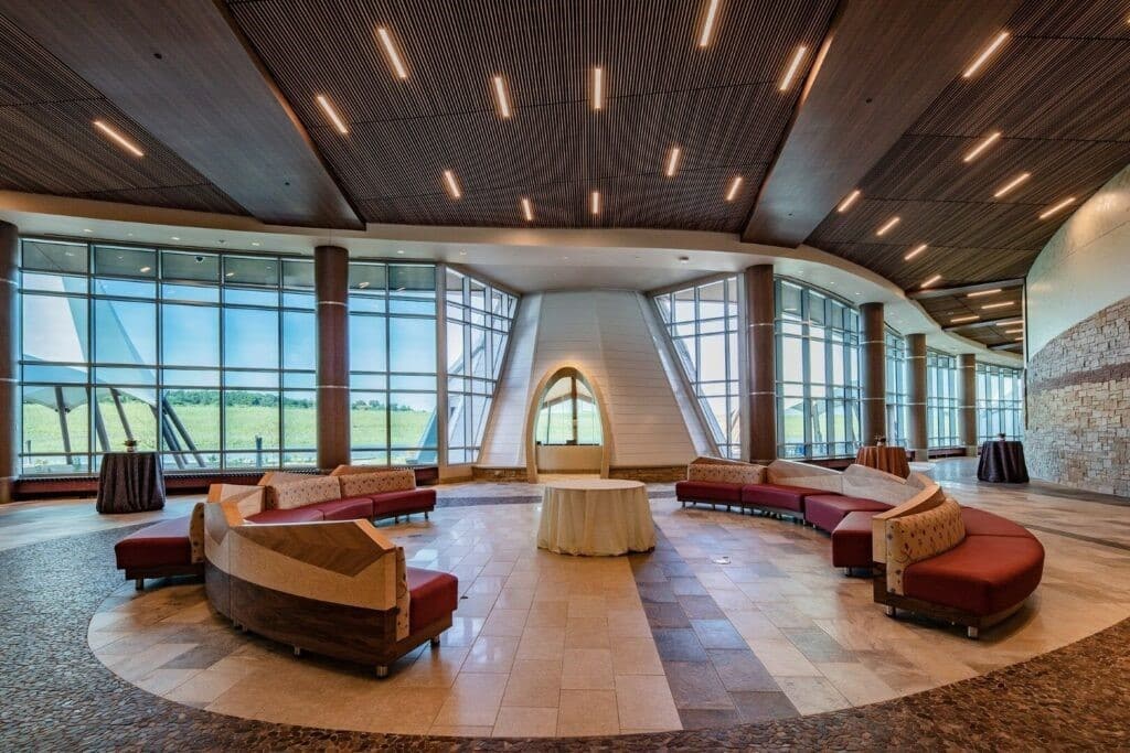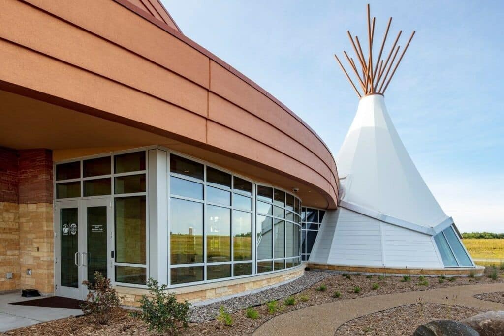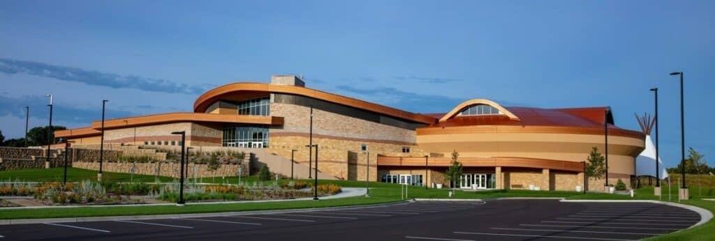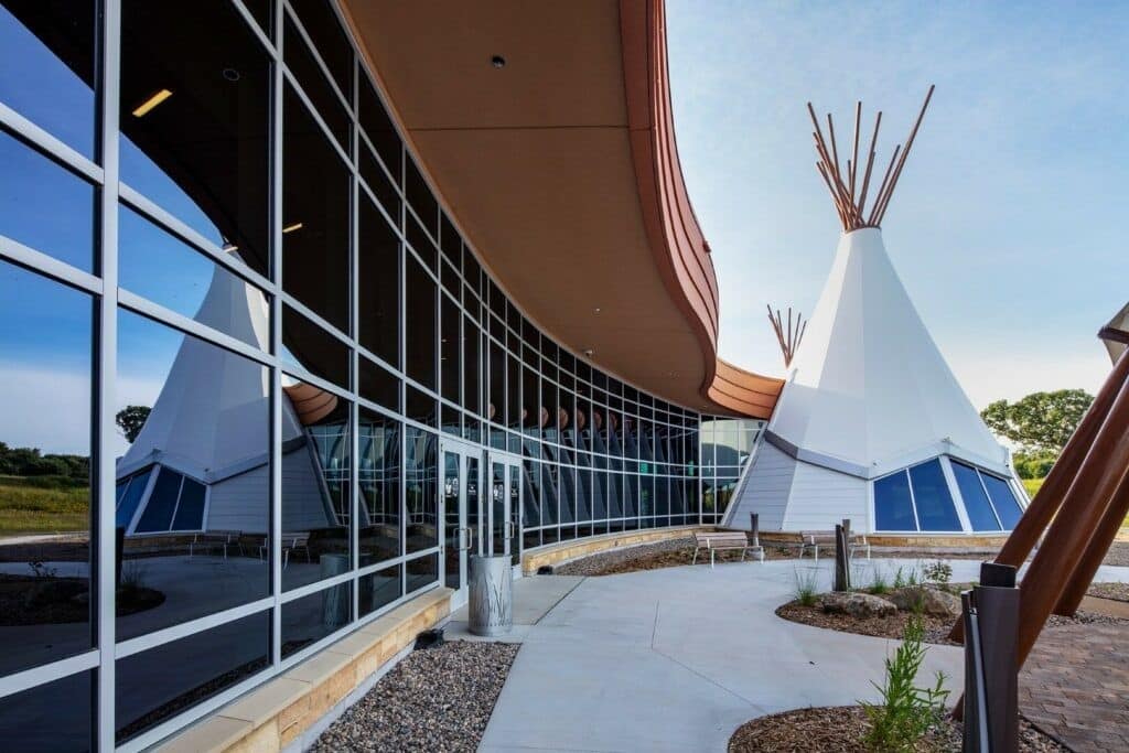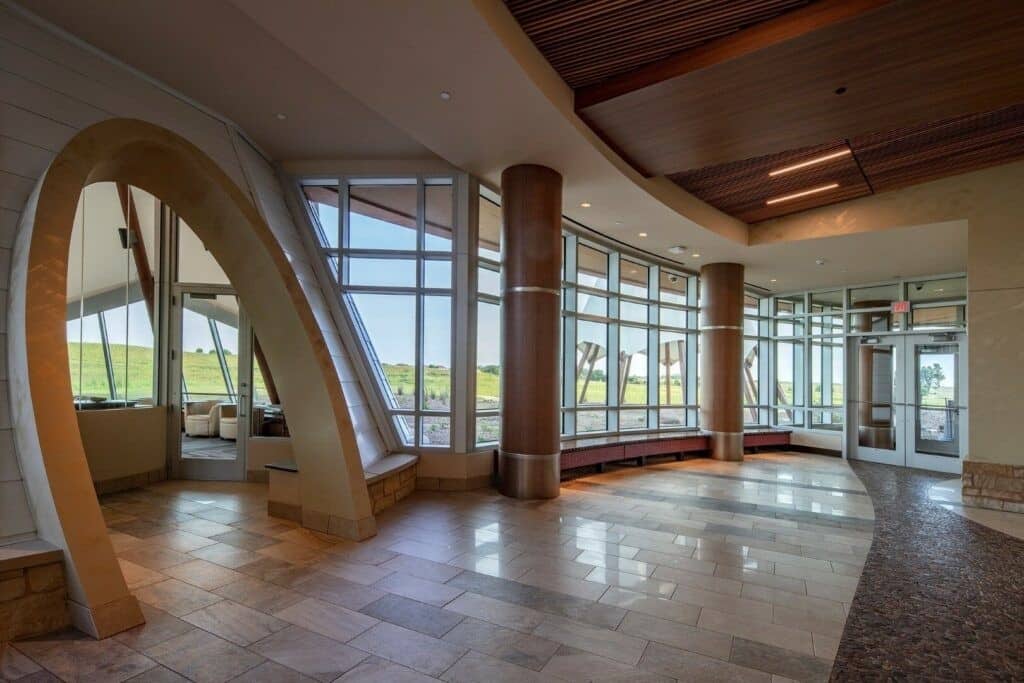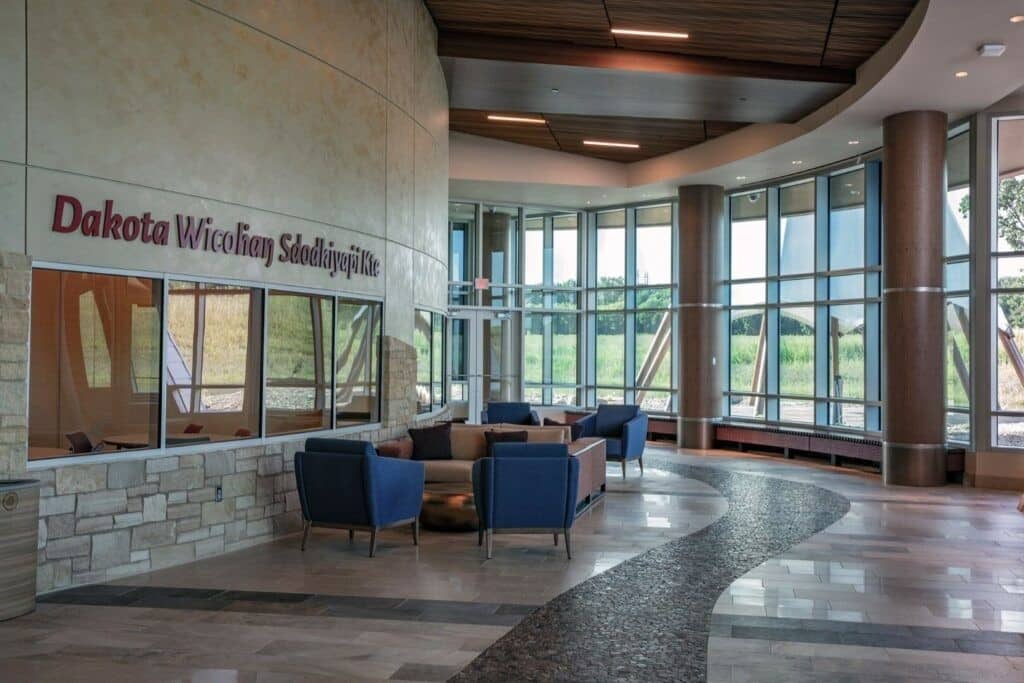 Le Hoċokata Ti a été construit pour valoriser et préserver le patrimoine, la langue et l’histoire traditionnels des Dakota Mdewakanton. La conception du bâtiment représente la tribu et reflète son engagement envers son environnement naturel avec un design extérieur qui semble naître de la terre. Avec un seul angle droit sur le mur périphérique extérieur et des puits de lumière dans les zones d’entrée, la construction est unique et accueille une lumière naturelle abondante.