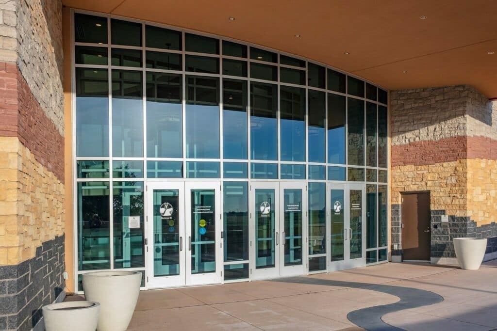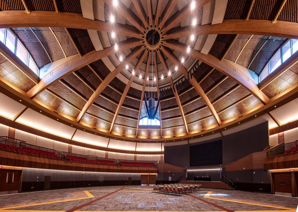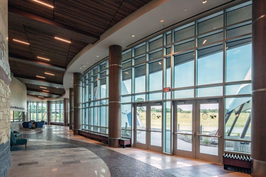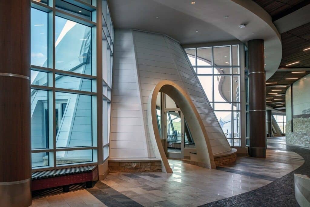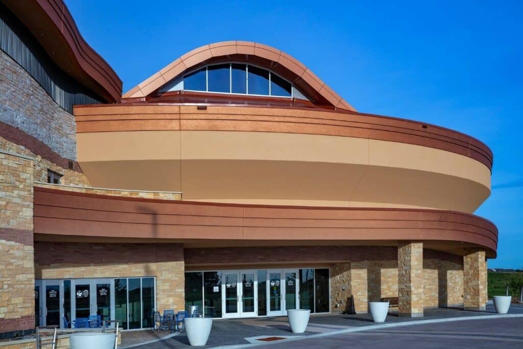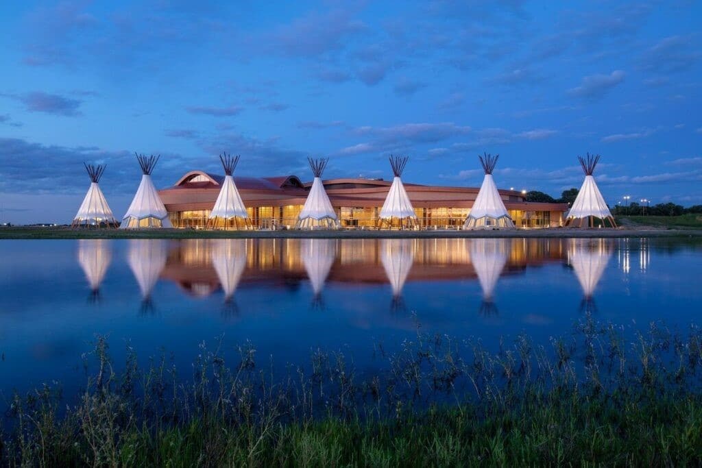 Le Hoċokata Ti a été construit pour valoriser et préserver le patrimoine, la langue et l’histoire traditionnels des Dakota Mdewakanton. La conception du bâtiment représente la tribu et reflète son engagement envers son environnement naturel avec un design extérieur qui semble naître de la terre. Avec un seul angle droit sur le mur périphérique extérieur et des puits de lumière dans les zones d’entrée, la construction est unique et accueille une lumière naturelle abondante.