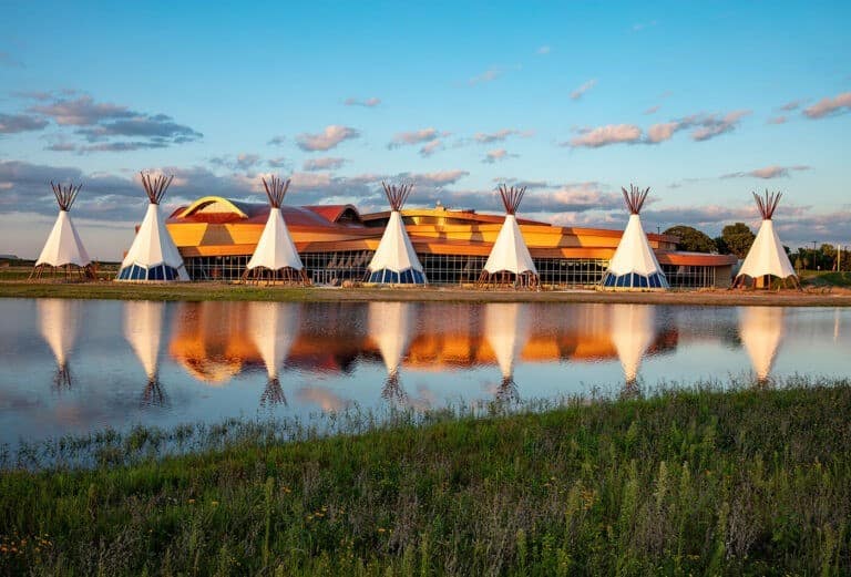 The Hoċokata Ti was built to encourage and reserve traditional Mdewakanton Dakota heritage, language and history. The design of the building reflects the tribe and is committed to its natural surroundings with an exterior design that appears to grow from the land. Featuring just one right angle on the exterior perimeter wall and skylights in the entry areas, the construction is unique and welcomes abundant natural light.