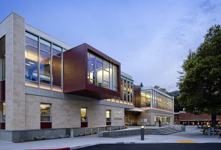 The LEED Gold® Los Gatos Public Library features our curtain wall, GLASSvent® visually frameless windows, Versoleil® sunshades, Trifab® framing and 190 narrow stile entrances. Kawneer worked closely with architects to design a custom solar shading system that perfectly balances visible light and daylight shade. Lighting was an essential element of the design, as the concept was based on libraries being the light of knowledge.