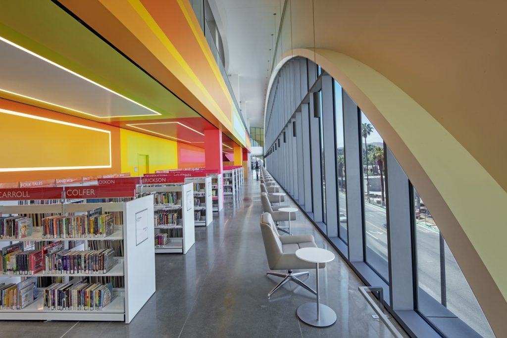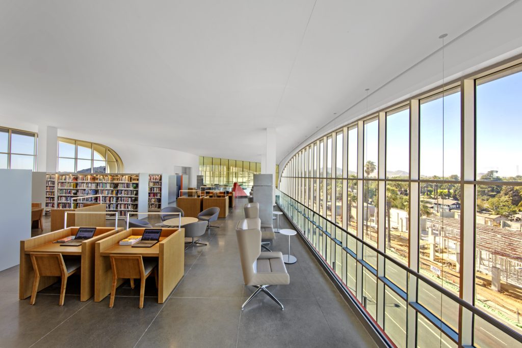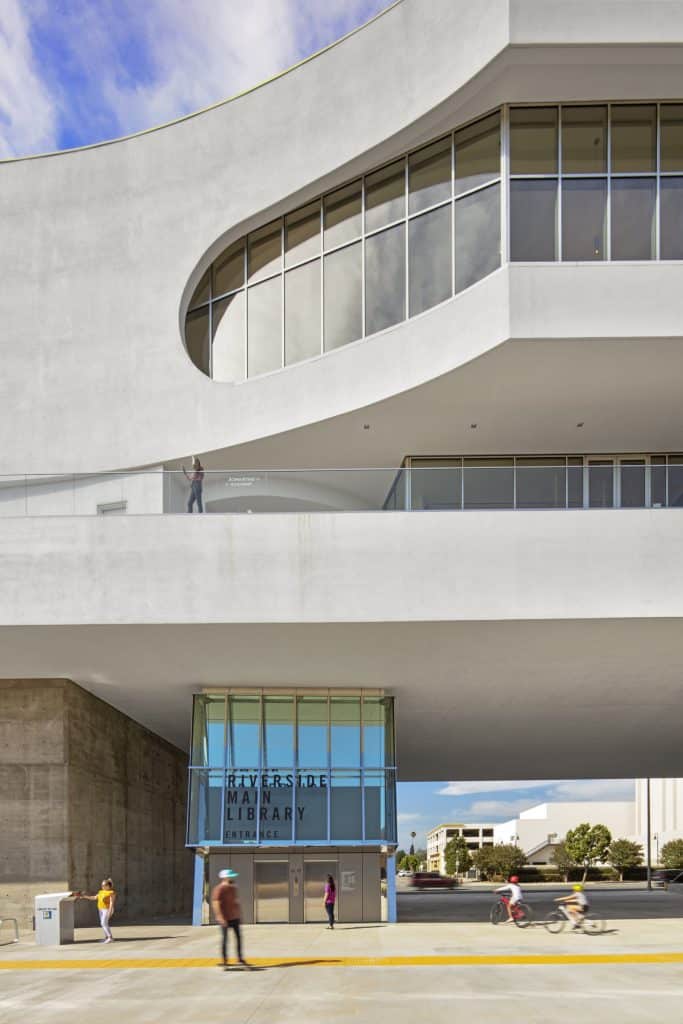 The two-story Riverside Main Library sits up 36 feet on massive concrete piers, creating an 8,900-square-foot shaded outdoor public plaza for hosting various community events. The library is housed on 2.5 acres and is within walking distance of the city’s cultural and business district. Kawneer’s 1600 Wall System®1 Curtain Wall System and EnCORE® Framing System were used to construct this project.