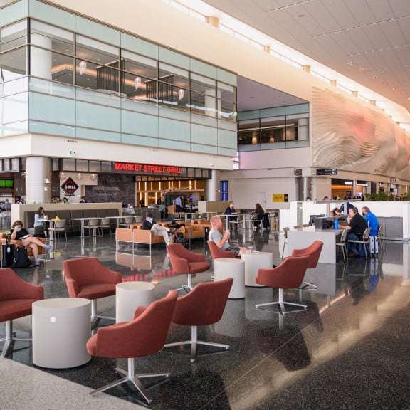 New dining and retail options reflect Utah’s culture and overall experience. Branding and wayfinding systems designed by HOK reflect the region’s adventurous spirit while assisting travelers in navigating the airport.
