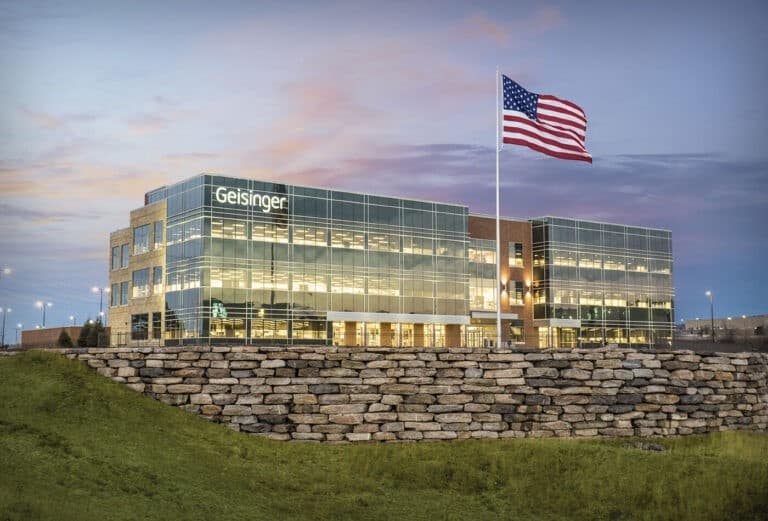 Geisinger support service employees occupy the three-story, 79,000-square-foot office building at CenterPoint Commerce and Trade Park near Pittston, Pennsylvania. Amenities include parking, a walking trail, a cafeteria and accessibility to public transportation. Curtain wall, framing and entrance products from Kawneer provide views and access to the outside while maintaining indoor comfort for occupants in the heat of summer or cold of winter.