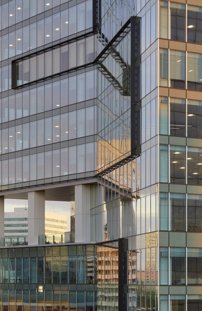 The river fin was a prominent design feature of the building. It was discovered during the project’s design assist phase that, in the initial design of the river fin, the attachment did not attempt to limit the thermal transfer to the interior of the building, which was a key concern given the building’s geographical location.