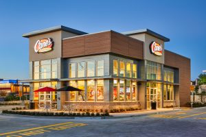 Raising Cane’s is a Baton Rouge, LA-based restaurant company known for its great crew, cool culture and active community involvement. With a vision to open locations across the United States, the fast-growing chain needs to stay consistent and true to its corporate branding and design. Kawneer’s national accounts team helps deliver a consistent visual appearance for Raising Cane’s restaurant locations by providing a full-service offering, including product and finish consistency and design, and assists throughout the entire process from ideation to completion.